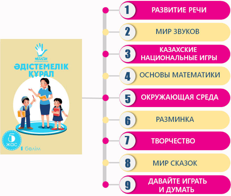 Инновационный познавательный комплекс “Negesh” для детей 5-х лет состоит из двух частей: методического пособия и рабочей тетради. Методическое пособие разработано в соответствии с Государственным общеобязательным стандартом образования и Типовой учебной программой дошкольного воспитания и обучения.