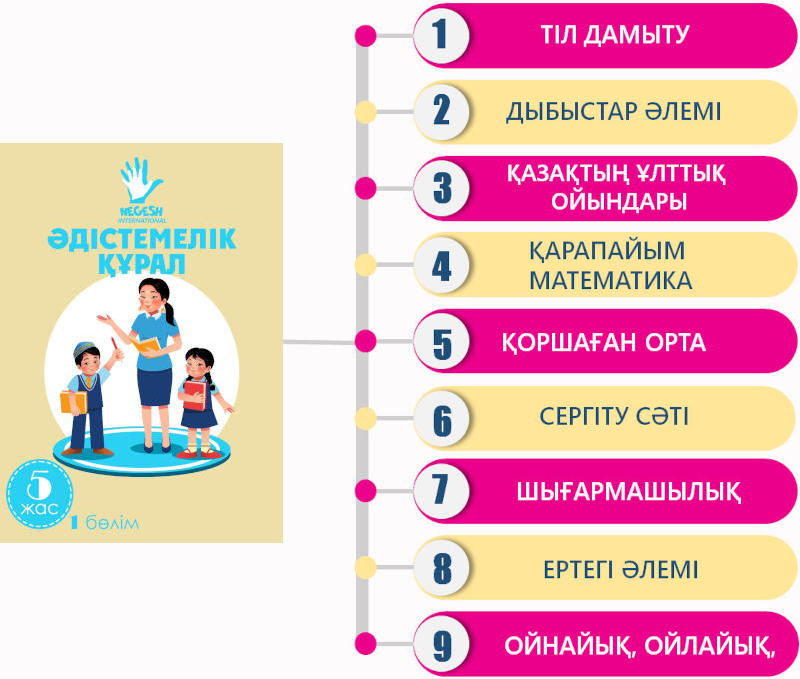 5 жастағы балаларға арналған “Negesh” инновациялық танымдық кешені әдістемелік құралы мен жұмыс дәптерінен тұрады. Әдістемелік құрал Мектепке дейінгі тәрбие мен оқытудың мемлекеттік жалпыға міндетті стандартына және Мектепке дейінгі тәрбие мен оқытудың Үлгілік оқу бағдарламасына сәйкес әзірленген.